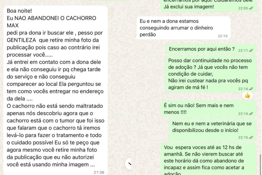 A publicação atingiu a mulher, que entrou em contato com Elaine alegando não ter abandonado o cão, afirmando que ele pertencia a outra pessoa, a quem caberia buscá-lo. A partir daí, as versões sobre a história se tornaram contraditórias, divergindo inclusive do que foi dito à veterinária. Em certo momento, Elaine comunicou à mulher que, caso ela não tivesse condições de cuidar do cão, não o devolveria nas condições em que se encontrava, recebendo apenas um emoji de “joinha” como resposta.