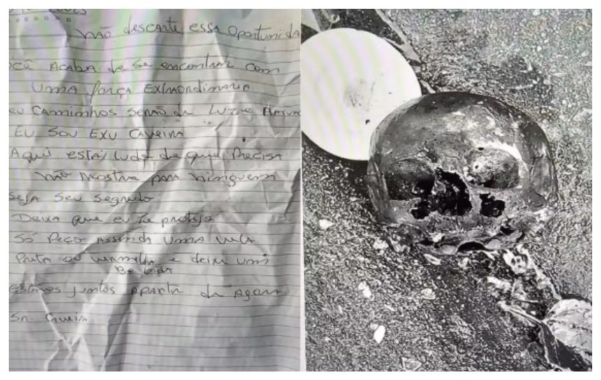 Junto ao crânio, foram encontrados um prato, duas velas (uma preta e outra vermelha, com a inscrição “Exu Caveira”) e uma carta assinada por “Sr. Caveira”.