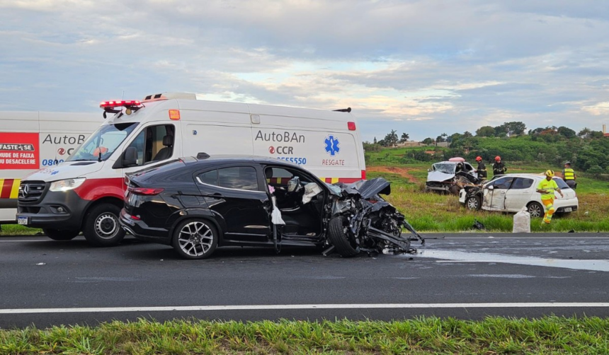 O acidente ocorreu no Km 149 da rodovia, no sentido norte, em direção ao interior paulista. A dinâmica inicial aponta para uma colisão frontal entre dois veículos de passeio, seguida por um terceiro carro que foi atingido lateralmente.